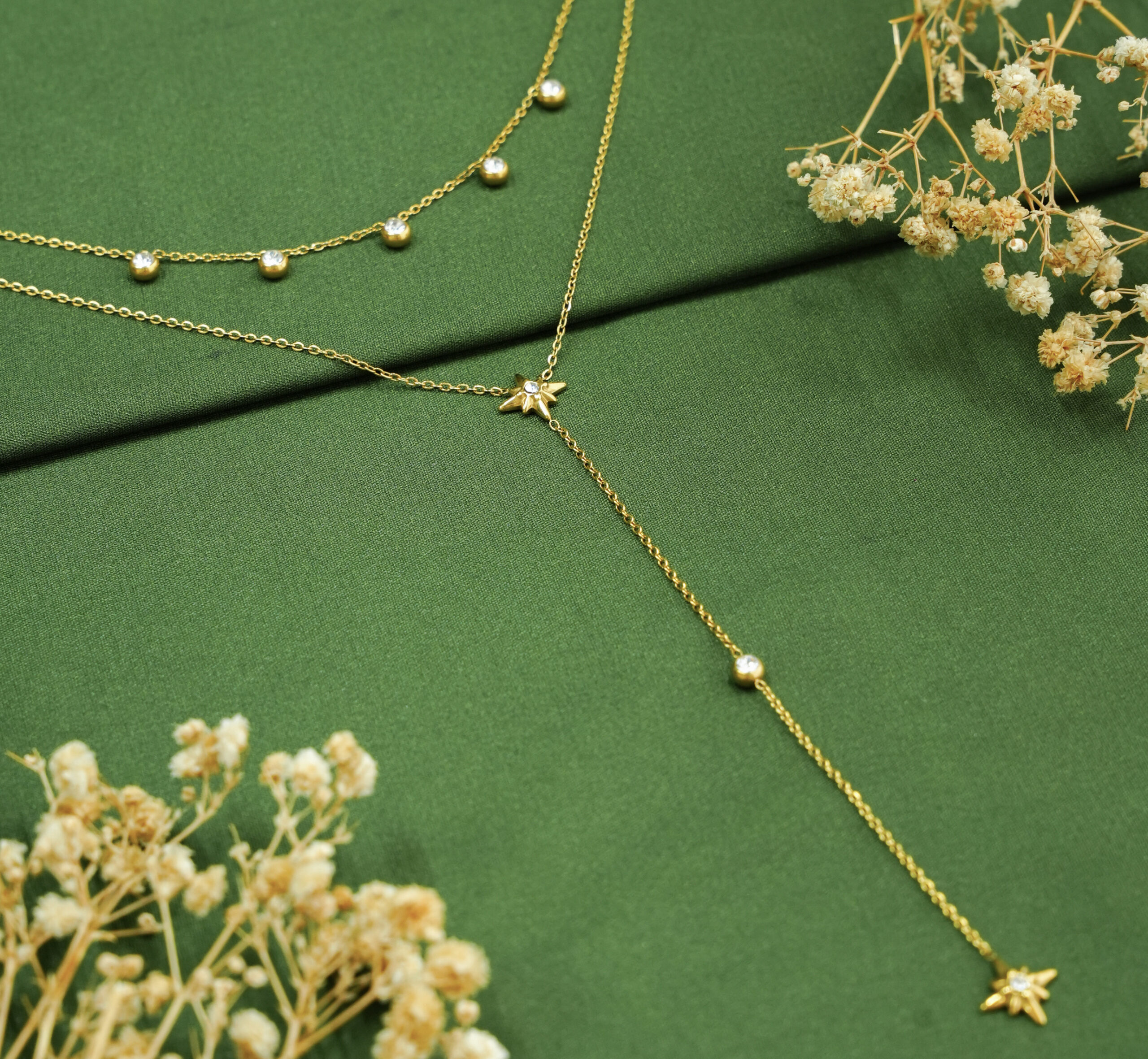 Delicate, luminous, and designed to move with you—the Lumière Layered Drop Necklace is the definition of understated luxury. Featuring fine gold chains adorned with subtle bead accents and a sleek drop silhouette, this piece adds depth and elegance to your everyday styling.